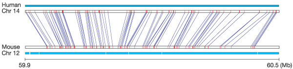 Conservation of synteny between human and mouse. We detected 558,000 highly conserved, reciprocally unique landmarks within the mouse and human genomes, which can be joined into conserved syntenic segments and blocks (defined in text). A typical 510-kb segment of mouse chromosome 12 that shares common ancestry with a 600-kb section of human chromosome 14 is shown. Blue lines connect the reciprocal unique matches in the two genomes. The cyan bars represent sequence coverage in each of the two genomes for the regions. In general, the landmarks in the mouse genome are more closely spaced, reflecting the 14% smaller overall genome size.