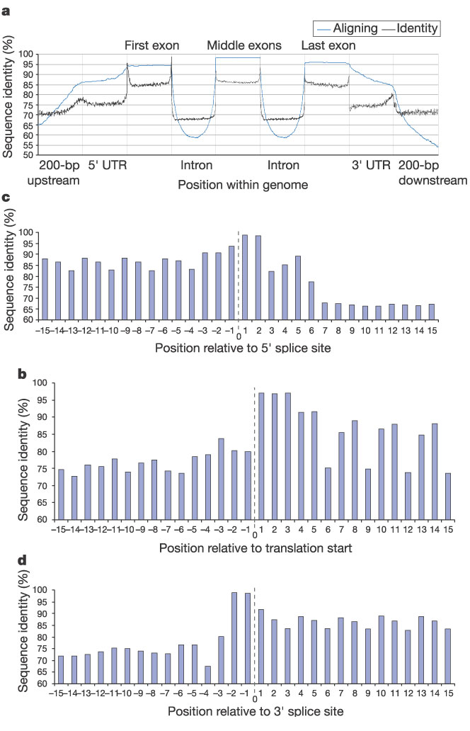 Variation in conservation across a gene. a, Conservation across a generic gene, on the basis of 3,165 human RefSeq mRNAs with known position in the genome. We sampled 200 evenly spaced bases across each of the variable-length regions labelled, resampling completely from regions shorter than 200 bp. The graph shows the average percentage of bases aligning and the average base identity when there is an alignment over each sample. There are peaks of conservation at the transition from one region to another. Here, in contrast to Table 16, only reviewed RefSeq mRNAs were used, and only those having at least 40 bases of annotated 5' and 3' UTRs. The resulting picture, however, is nearly indistinguishable from that obtained by using all RefSeq genes with at least 40 base UTRs. b, Conservation near translation start site using the same data set as in a. The bars show per cent identity of the 15 bases to either side of translation start. Note the extreme conservation of the first codon. After this, there is substantially less conservation at the third codon position. The peak at position -3 corresponds to a purine in the Kozak consensus sequence. c, Conservation near the 5' splice site. The peak of conservation corresponds to the AG/GT consensus at this location, with the first G in the intron being nearly invariant. A G in the fifth base of the intron is also found in a large majority of 5' splice sites. An echo of the variation in the third codon position occurs here because it is common for exons to begin and end at codon boundaries. d, Conservation near the 3' splice site. Conservation in the last two bases of the intronalways AG for introns processed by the major spliceosomeis very apparent. The polypyrimidine tract beginning five bases into the intron is also visibly conserved. Once again, an echo of the variation in the third codon position can be seen.
