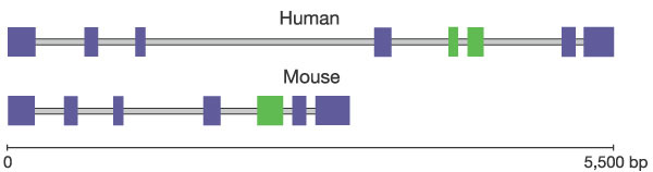 The human spermidine synthase gene (SRM) on chromosome 1, involved in the biosynthesis of polyamines, and its mouse orthologue (Srm) on chromosome 4. The fifth exon in the mouse gene (green) is interrupted by an intron in the human homologue. All other exons are purple.