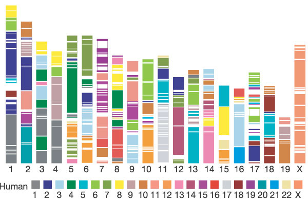 Segments and blocks >300 kb in size with conserved synteny in human are superimposed on the mouse genome. Each colour corresponds to a particular human chromosome. The 342 segments are separated from each other by thin, white lines within the 217 blocks of consistent colour.