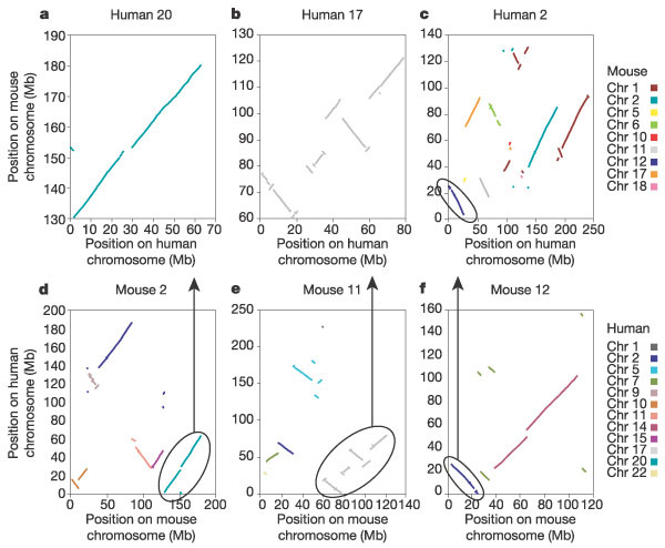 Dot plots of conserved syntenic segments in three human and three mouse chromosomes. For each of three human (ac) and mouse (df) chromosomes, the positions of orthologous landmarks are plotted along the x axis and the corresponding position of the landmark on chromosomes in the other genome is plotted on the y axis. Different chromosomes in the corresponding genome are differentiated with distinct colours. In a remarkable example of conserved synteny, human chromosome 20 (a) consists of just three segments from mouse chromosome 2 (d), with only one small segment altered in order. Human chromosome 17 (b) also shares segments with only one mouse chromosome (11) (e), but the 16 segments are extensively rearranged. However, most of the mouse and human chromosomes consist of multiple segments from multiple chromosomes, as shown for human chromosome 2 (c) and mouse chromosome 12 (f). Circled areas and arrows denote matching segments in mouse and human.