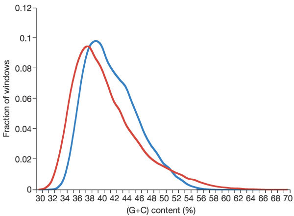 Distribution of (G+C) content in the mouse (blue) and human (red)