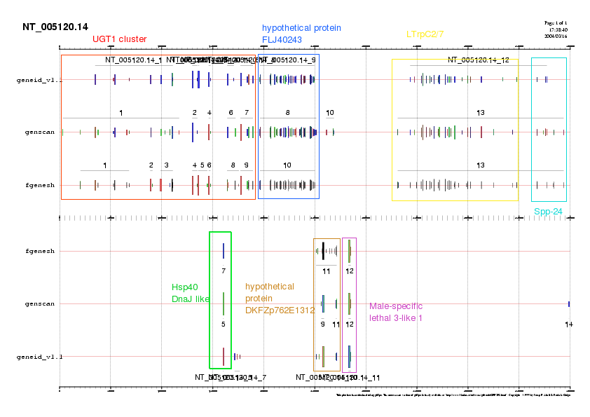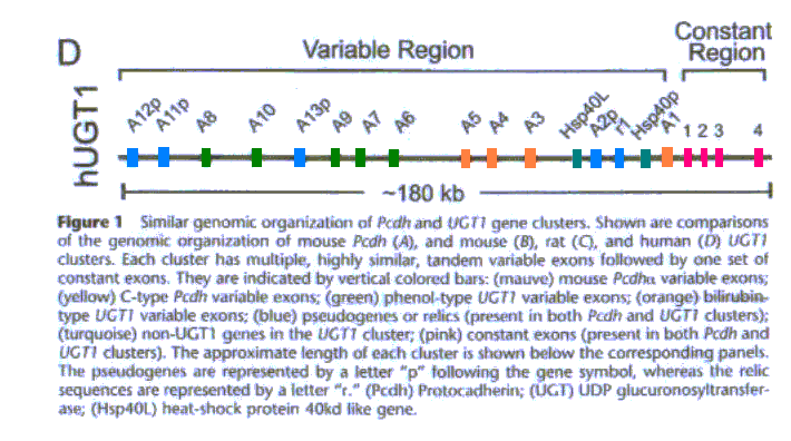 Deguda l'alta complexitat d'aquest fragment buscarem informació sobre la UGT1. A partir de l'article Multiple Variable First Exons: A Mechanism for Cell- and Tissue-Specific Gene Regulation. Zhang et al. sabem que aquest fragment correspon a un cluster de gens de la UGT1, proteïnes que entre elles es diferencien únicament pel domini N-terminal. Aquest cluster conté una regió variable d'exons amb alta homologia entre ells disposats en tandem, una regió constant de quatre exons, i exons que pertanyen a pseudogens (UGT1 A11p, A12p, A13p, A2p) i a altres proteïnes no homòlogues, com la Hsp40-DnaJ like. Aquest cluster de gens no és un sol gen que pateix splicing alternatiu com semblaven suportar els ESTs, sinó un conjunt de gens amb una regulació poc usual en què cada exó de la regió variable es troba sota control d'un promotor propi.