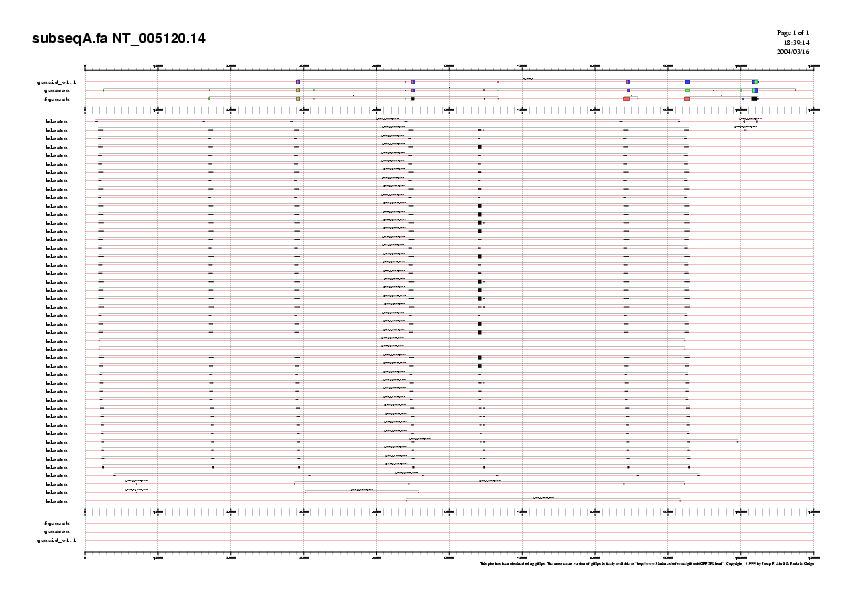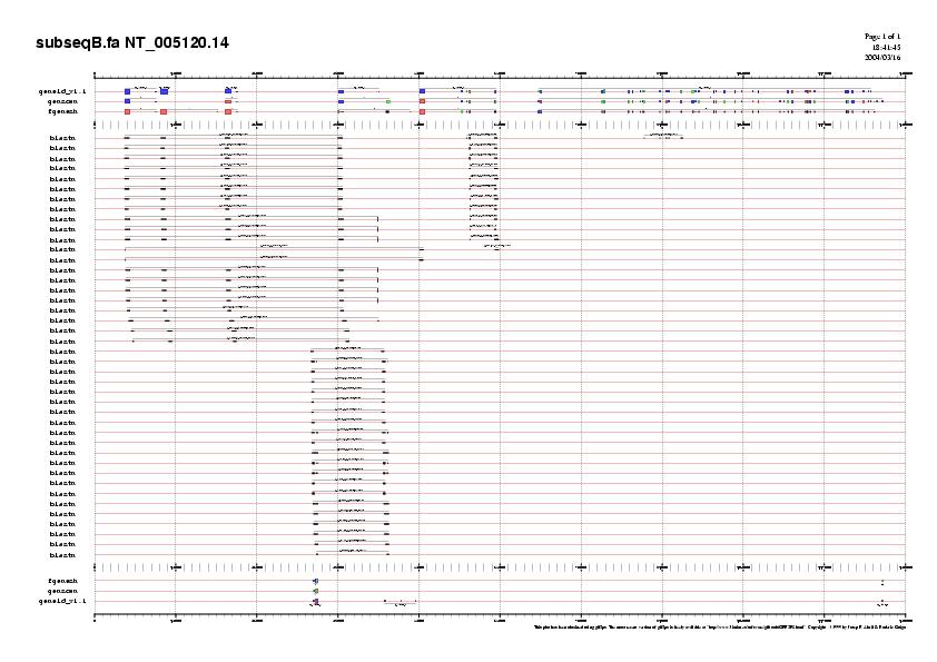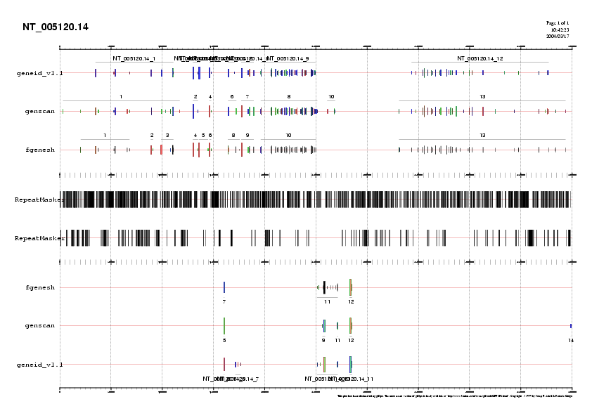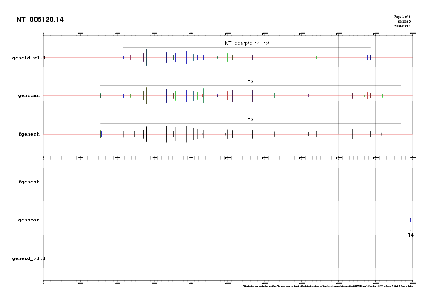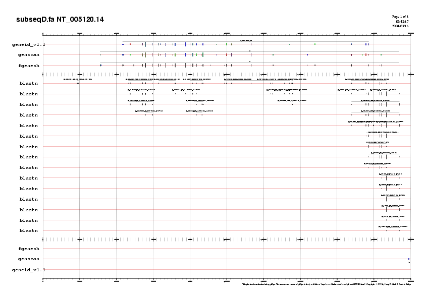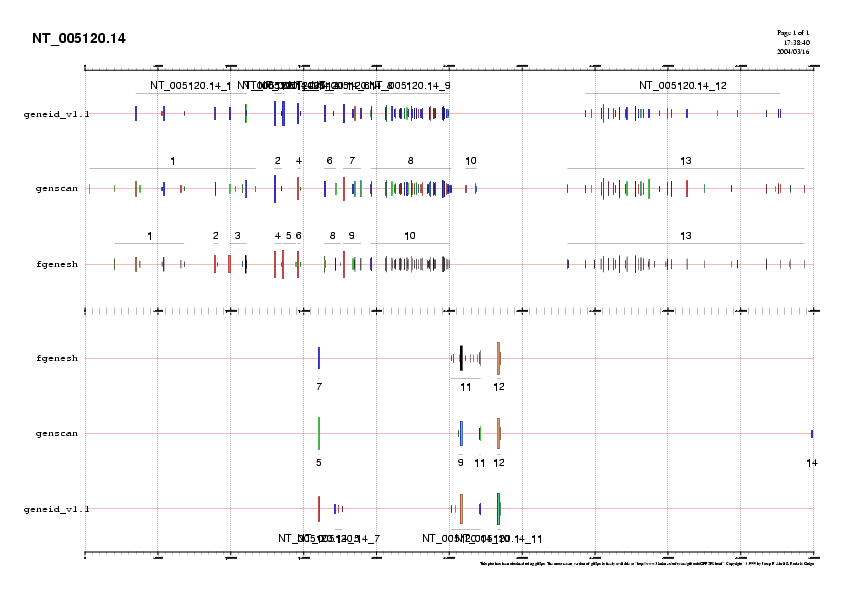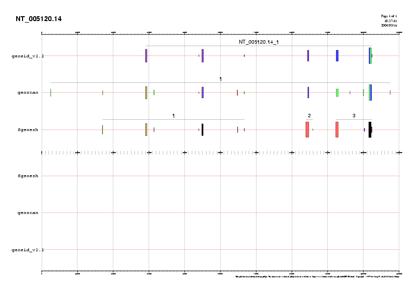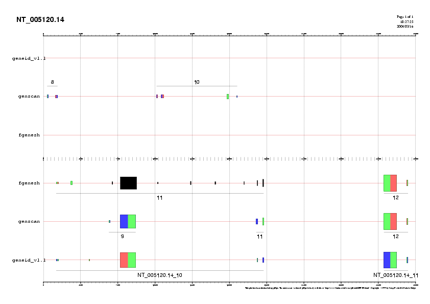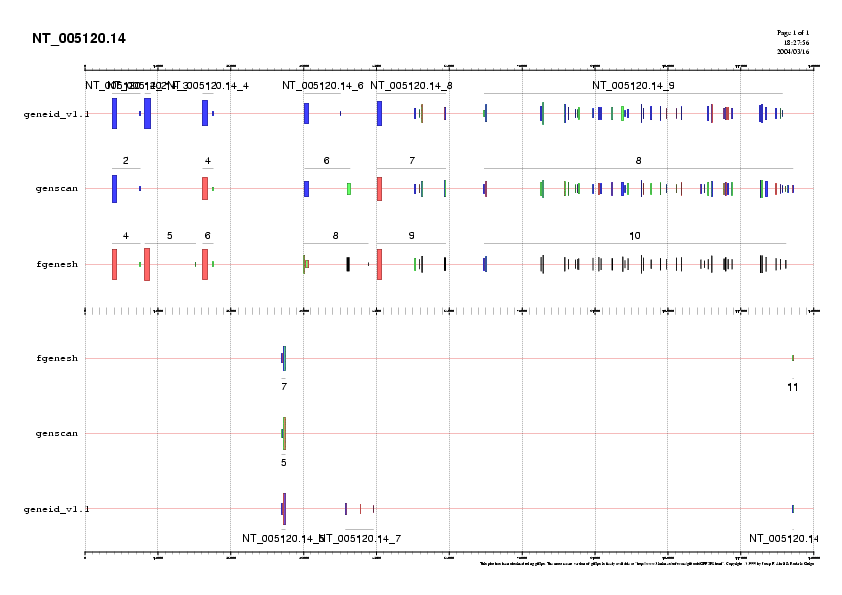 Preparem 4 arxius amb les prediccions fetes per GENEID, GENSCAN i FGENESH per cada bloc i que anomenem NT_005120.14.genepredictions*.gff. Aquests arxius els podem passar a .png i visualitzar-los (llavors veuriem l'agrupació dels diferents exons formant gens) o unir-los a l'arxiu d'ESTs per poder comparar la predicció feta pels programes i els ESTs coneguts.