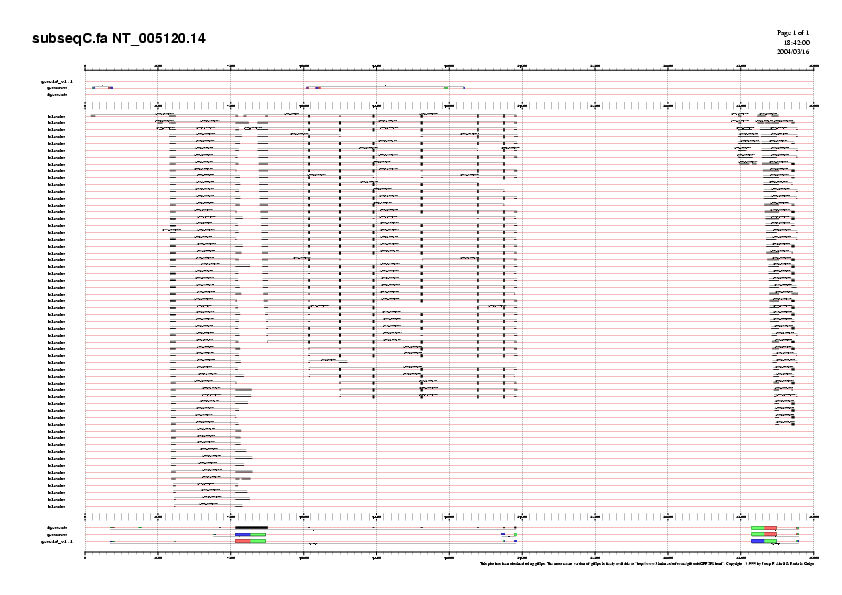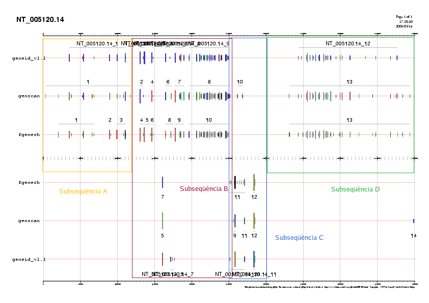 GENEID prediu 6 gens de 2, 1, 2, 2, 5 i 35 exons en forward, i 2 gens de 2 i 3 exons; en reverse. GENSCAN prediu 5 gens de 2, 2, 2, 5 i 40 exons en forward, i un gen de 2 exons en reverse. FGENESH prediu 6 gens de 2, 2, 2, 4, 5 i 37 exons en forward, i un gen de 2 exons en reverse (els gens 14 de GENEID i 11 de FGENESH corresponen a la subseqüència C). És destacable la falta d'un exó en la predicció per GENSCAN (corresponent als gens 2 de GENEID i 5 de FGENESH).