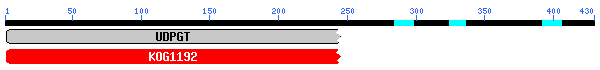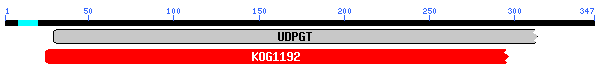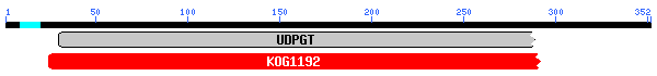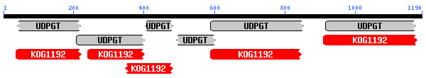 De nou l'esquema de dominis conservats mostra un fragment N-terminal d'un domini UDP-glucoronosyltransferase i UDP-glucosyltransferase, amb un e-value de 2e-89. En el cas del BLAST tornem a trobar múltiples alineaments significatius amb membres de la família de les UGT1.