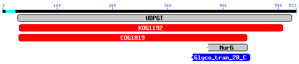 S'obté un domini sencer conservat corresponent a UDP-glucoronosyltransferase i UDP-glucosyltransferase amb un e-value de 0.0. També s'obtenen fragments C-terminals de dominis MurG UDP-N-acetylglucosamine i Glycosyltransferase family 28, amb e-values majors. Els resultats de BLASTP tornen a donar múltiples alineaments amb UDP-glucoronosyltransferases (UGT1), amb uns e-values de 0.0.