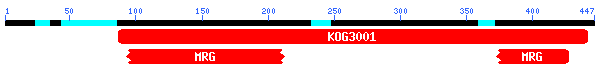 Els resultats mostren un domini Dosage compensation regulatory complex/histone acetyltransferase complex, amb un e-value de 1e-76, i dos fragments d'un domini MRG (que comprén 3 proteïnes, mortality factor 4, male-specific lethal 3 i ESA1-associated factor 3), amb e-values majors. Els resultats del BLAST mostren un alineament bastant òptim amb la Male-specific lethal 3-like 1 (e-value de e-160). Tenint en compte les dues dades podem deduir que la proteïna predita es tracta de la Male-specific lethal 3-like 1.