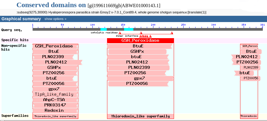 Observant on començava i on acabava cada proteïna vam veure que la primera que ens reportava l'Exonerate englobava les altres dues, de manera que obteniem una proteïna predita molt llarga. Tal i com mostra el resultat del BLASTp aquesta proteïna (en els tres hits) conté en la seva seqüècia la GSH peroxidase i altres dominis proteics situats upstream i downstream de la mateixa.