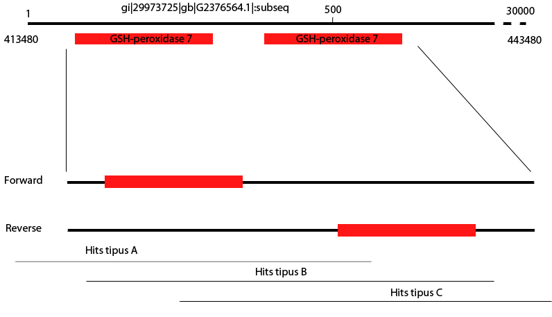 Esquema de la nostra hipòtesi: a cada strand trobem un dels gens i els hits solapants agafen diferents regions.