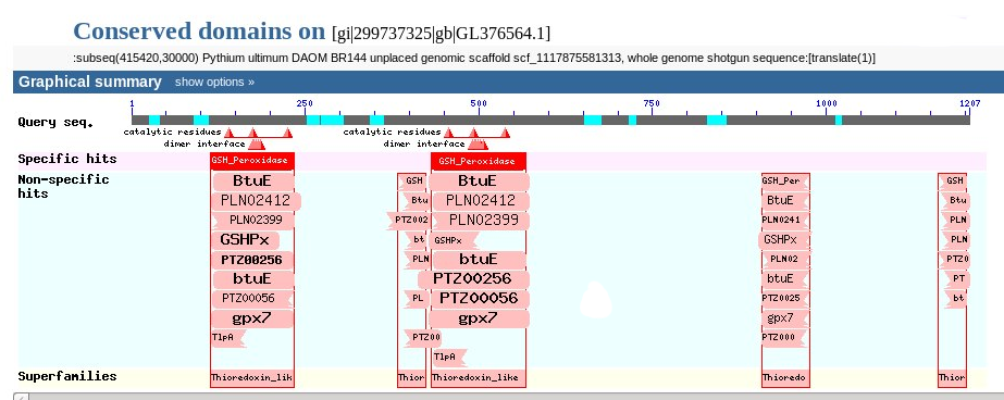 Com que no sabíem com interpretar això vam analitzar aquesta macroproteïna amb el BLASTp contra la base de dades de seqüències proteiques no redundants d'NCBI. En aquest resultats observem que la proteïna obtinguda conté realment dues còpies d'un membre de la familia de les Glutatió peroxidases (que podria ser la GPx7) i a més, diverses còpies de dominis Thioredoxin like.